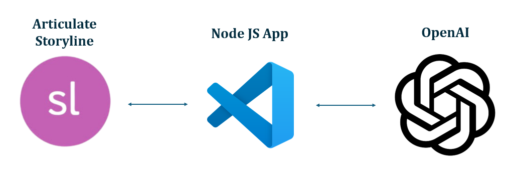 The Storyline course sends Javascript triggers to a Node.js app, which uses the OpenAI API to call on ChatGPT:
