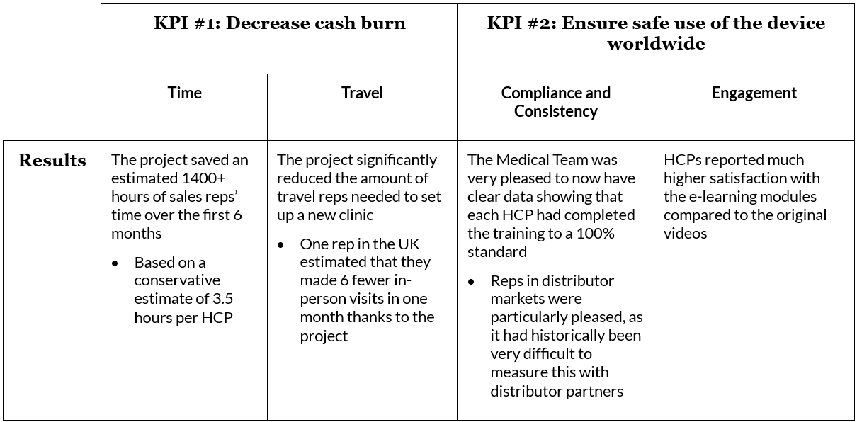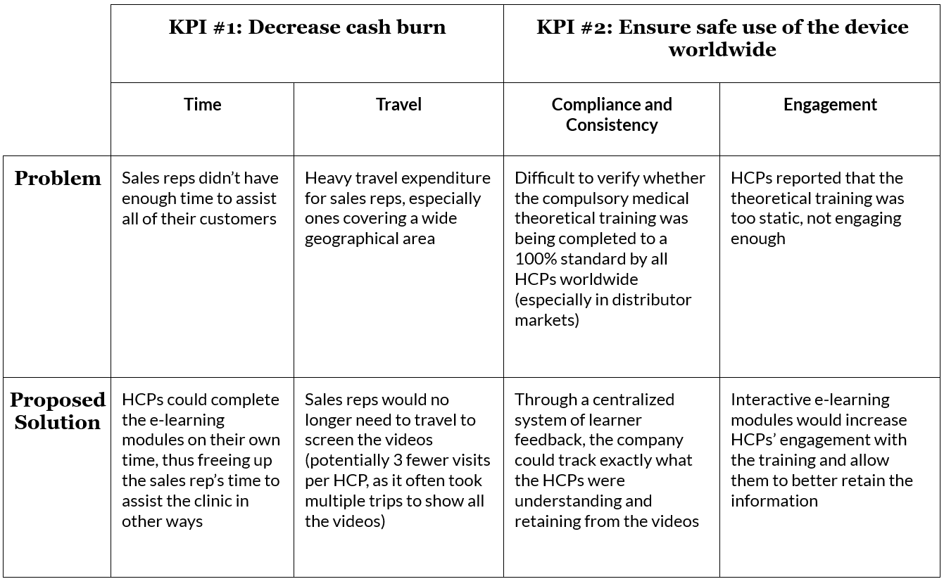 The existing theoretical training consisted of a series of videos which sales reps were required to show in person. They would travel to a clinic and, to ensure compliance, stayed in the room and observed the HCPs watching the videos. Later on, a medical specialist would then train the HCPs on how to use the device during a hands-on demonstration.
