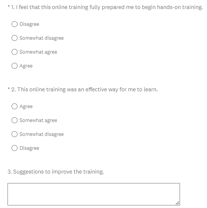 To obtain learner feedback on the training, I added a quick anonymous survey (3 questions) as the second-to-last step of the course:
