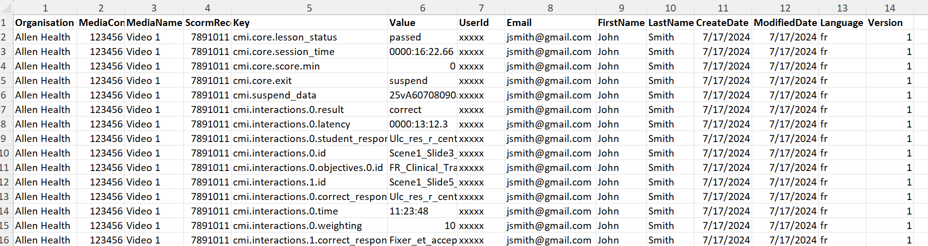 Obtaining clear learner data from the company’s LMS proved a challenge, as the LMS was relatively “SCORM-unfriendly”. It did not support xAPI statements, and SCORM data could only be obtained through a raw SCORM report showing cmi interactions: